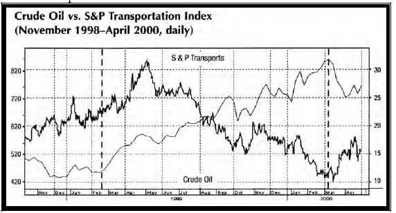 (На правой части графика можно видеть, как откат нефтяных цен в первом квартале 2000 года придал ускорение транспортным бумагам.)