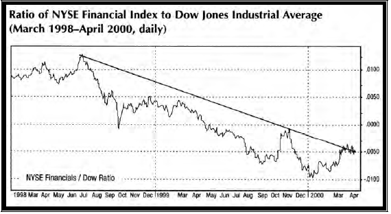 Рис. 21 представляет график отношения Финансового Индекса Нью-йоркской фондовой биржи (NYSE Financial Index) к DJIA. Драматическое падение линии демонстрирует поведение финансовых акций во второй половине 1998 года и в течение всего 1999 года относительно остального рынка. Такое поведение финансовых акций в 1999 году, подтвердило повышающийся тренд в ценах товарных фьючерсов и в процентных ставках США.