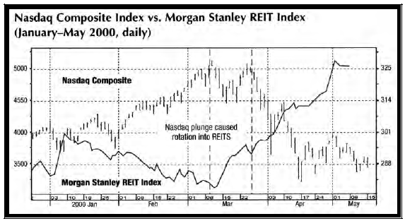 Денежный поток в потребительский сектор и оборонительные бумаги, в частности, в первую половину 2000 года был частично вызван неожиданным разворотом в технологическом секторе и более настороженным поведением на рынке акций. Весной 2000 года совокупный индекс NASDAQ (Nasdaq Composite Index) потерял более 30 % своей стоимости, в течение нескольких недель. Однако, это задело только тех инвесторов, которые были сконцентрированы на технологических бумагах, в то время, как оборонительные акции, типа, компаний, связанных с недвижимостью, выросли в цене. Рис. 23 показывает, что сильное падение Совокупного Индекса Nasdaq, в котором доминируют технологические бумаги, почти идеально совпадает с резким взлетом Индекса REIT[9] Морган Стэнли (Morgan Stanley REIT Index (RMS)). График показывает, что часть денег бежит из технологического сектора в сектор недвижимости.