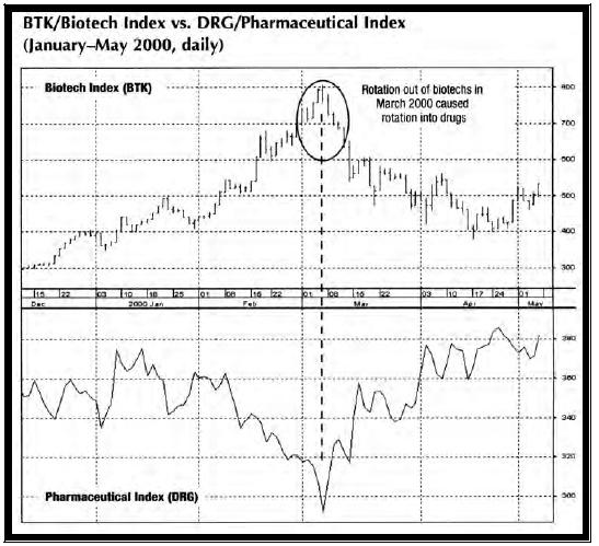 Бумаги компаний, связанных с недвижимостью, традиционно, служат оборонительным "убежищем" во времена слабости рынка, в силу их малой коррелированности с остальными бумагами на рынке. К счастью, межрыночный чартист был в состоянии легко обнаружить эти изменения в рыночных предпочтениях и заработать на них.