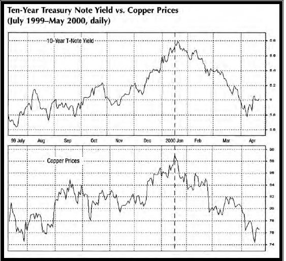Рис. 25 демонстрирует необходимость наблюдения за медным рынком для трейдеров казначейских обязательств (и облигаций). График показывает замечательную корреляцию между ценами на медные фьючерсы и доходностью 10-ти летних казначейских обязательств в течение второй половины 1999 года и первого квартала 2000-го. Коррекционный откат меди, начиная с января 2000-го, идеально совпал с откатом в доходности казначейских обязательств.