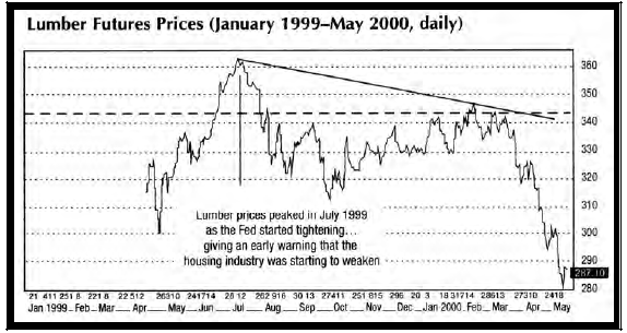 Другим товаром, который может иметь предсказательную ценность для экономики и рынка акций, являются лесоматериалы (lumber). Поскольку они напрямую связаны с рынком жилья, который, в свою очередь, считается опережающим индикатором экономических трендов. Рис. 26 показывает, как цены на лесоматериалы достигли максимума в июле 1999 года, как раз в тот момент, когда ФРС начала повышать процентные ставки. Хотя, в начале 2000 года, общепринятое мнение считало, что серия повышения ставок ФРС, будет иметь лишь небольшой увлажняющий эффект на экономику США, коллапс в ценах лесоматериалов, рассказывал, похоже, другую историю.
