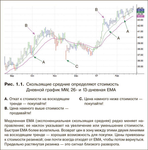 Сильные тренды очаровывают новичков: если купить на дне, отчетливо видном в середине графика, и держать позицию до конца ралли, то можно заработать кучу денег. Опытные трейдеры знают, что крупные тренды, такие четкие в середине графика, у правого края становятся весьма туманными. Следовать за трендом – все равно что скакать на необъезженной лошади, которая пытается сбросить вас на каждом повороте. Торговля на тренде намного сложнее, чем кажется.