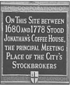 Шум, создаваемый толпами брокеров, вызывал раздражение у чопорного руководства биржи, и именно по этой причине в 1698 году брокерам, работавшим с ценными бумагами, был запрещен доступ на Королевскую биржу с формулировкой «за недостойное поведение». Лишившись, таким образом, постоянного места, биржевые маклеры стали собираться в помещении Ост-Индской Компании, фирмы Hudson Bay, других акционерных обществ, но чаще всего – во всевозможных кофейнях, расположенных на прилегающих к Королевской бирже улицах. Со временем в качестве основного центра таких собраний была избрана кофейня «У Джонатана», где в определенные дни встречались до полутора сотен брокеров, чтобы поторговаться, провести взаиморасчеты, подсчитать свои прибыли, убытки и комиссионные.