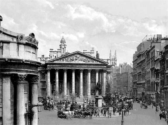 Королевская биржа в Лондоне была товарной более ста лет, и только с 1695 года на ней начинают осуществляться сделки с государственными бумагами и акциями компаний (к концу XVII века число акционерных обществ приближалось к полутора сотням, старейшему из которых, «Московской компании», созданной с целью торговли с Россией, исполнилось к этому времени 140 лет), а также с акциями Английского банка.