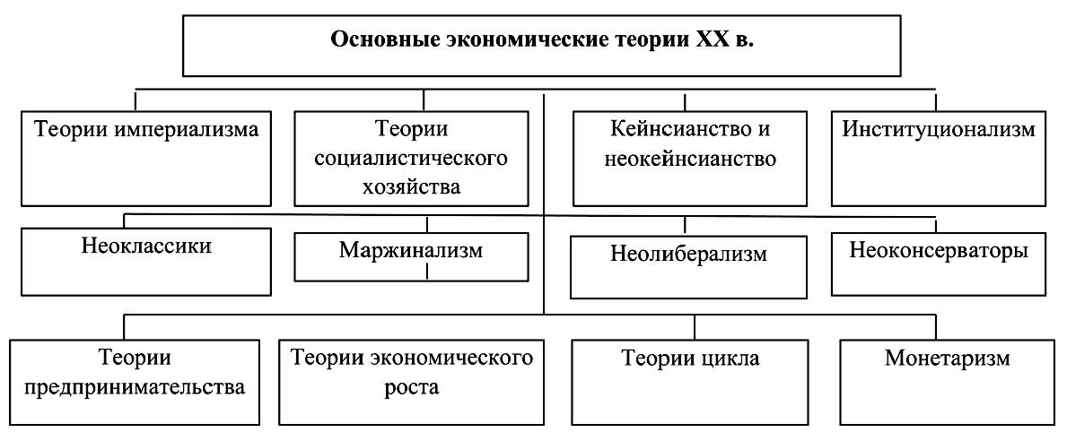 Интересы движут человечество. Без интереса, по словам К. Маркса, посрамляла себя любая идея. Существует множество экономических теорий, но на практике реализуются лишь те, которые выражают интересы определенных групп людей, классов. При господстве частной собственности на средства производства чаще всего реализуются теории, выражающие интересы владельцев фабрик и заводов. XIX в. – это век крушения наследственных монархий и безраздельного господства буржуазии. При этом XX в. – век активного распространения марксизма. Появилось немало теорий, которые пытаются соединить всё позитивное, что есть в социализме, с положительными сторонами капитализма и создать третий путь развития. Основные теории XX в. можно представить следующей схемой: