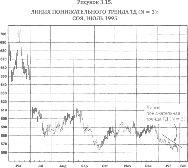 Различные значения N приводят к весьма разным трендовым линиям. Например, на рис. 3.19–3.21 представлены различные понижательные линии тренда ТД, полученные на одном и том же графике при использовании трех разных значений N. Чем ниже значение N, тем чаще корректируется понижательная линия тренда и тем она более чувствительна к пробою. Сравните, например, дюжину трендовых линий, полученных при N = 2, и всего лишь три линии, когда использовалось значение N = 10.