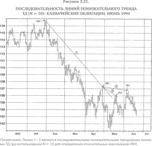 Определение трендовых линий исходя из самых последних относительных максимумов и минимумов позволяет постоянно корректировать линии тренда по мере появления новых относительных максимумов и относительных минимумов. Например, рис. 3.17 демонстрирует последовательность повышательных трендовых линий ТД, которые были построены вслед за появлением новых относительных минимумов (при N = 10) вплоть до получения сигнала о развороте тренда. На этом графике сигнал разворота тренда определяется как три последовательных закрытия ниже действующей повышательной трендовой линии. Аналогичным образом рис. 3.18 иллюстрирует последовательность понижательных трендовых линий ТД, построенных по относительным максимумам (при N = 8) вплоть до получения сигнала о развороте тенденции (также определяемого как три последовательных закрытия за пределами линии тренда).