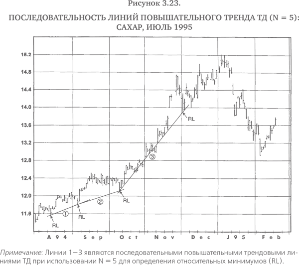 Определение трендовых линий, данное ДеМарком в его книге, эквивалентно вышеприведенным определениям при N = 1. Хотя он признает, что линии тренда могут строиться с использованием более высоких значений N – «линии ТД большего масштаба», согласно его терминологии, – сам он говорит о своем предпочтении трендовых линий, построенных на основе базисного определения. Мое личное предпочтение является почти противоположным. Хотя вполне очевидно, что использование N = 1 для построения трендовых линий позволит получить более ранние сигналы о реальных пробоях, критическим противовесом этому является то, что подобный подход порождает очень короткие линии тренда, подающие много ложных сигналов о пробоях. В качестве основного принципа, я думаю, стоит руководствоваться следующим: намного важнее избежать плохих сигналов, чем успеть отреагировать на хорошие. Поэтому при построении трендовых линий я предпочитаю использовать более высокие значения N (например, от 3 до 12).