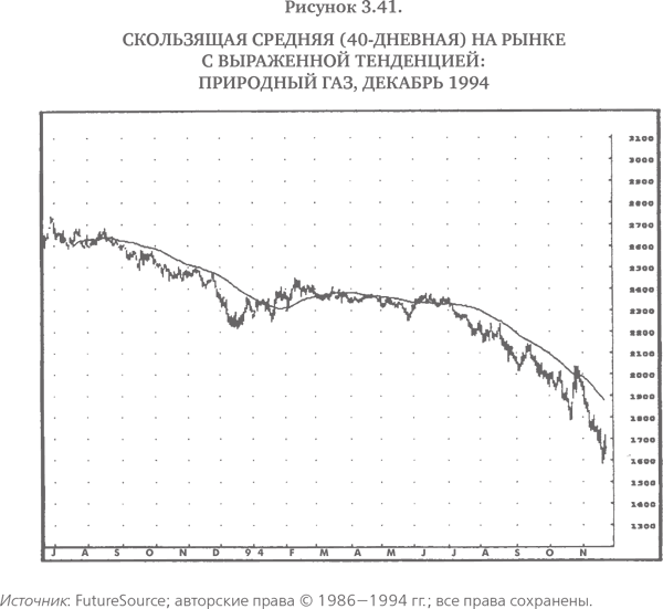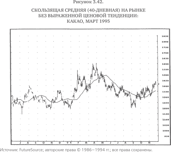 Скользящие средние являются очень простым инструментом сглаживания ценовых рядов, что делает любые тренды более наглядными. Простая скользящая средняя определяется как средняя цена закрытия за последние N дней, заканчивая текущим днем. Например, 40-дневная скользящая средняя будет равна среднему значению последних 40 закрытий[5] (включая текущий день). Термин скользящая средняя означает, что набор усредняемых значений непрерывно движется во времени. На рис. 3.41 показана 40-дневная скользящая средняя, наложенная на ценовой ряд. Заметьте, что скользящая средняя четко отражает тенденцию изменения цен и сглаживает их несущественные колебания. На рынках, где ярко выраженная ценовая тенденция отсутствует, скользящая средняя, как правило, изменяется в некотором горизонтальном диапазоне (см., например, период с октября 1993 г. по май 1994 г. на рис. 3.42).