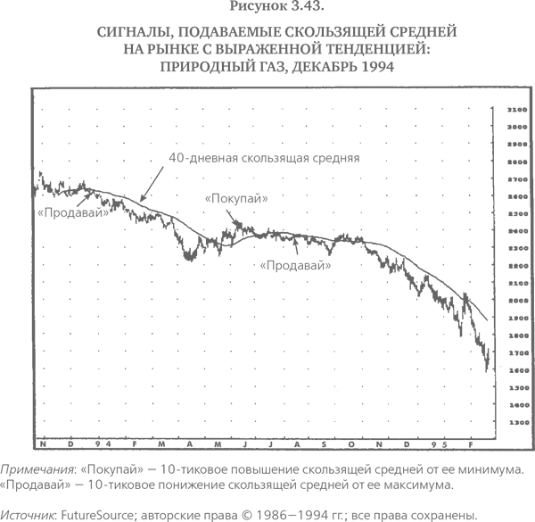 На рынках с выраженной тенденцией скользящие средние являются очень простым и эффективным методом ее выявления. Рис. 3.43 воспроизводит рис. 3.41, обозначая сигналы к покупке в точках, где скользящая средняя поворачивает вверх по крайней мере на 10 тиков, и сигналы к продаже в точках, где скользящая средняя поворачивает вниз на такое же минимальное значение. (Причиной установления порогового значения разворота при определении поворотов скользящей средней является необходимость удержать трендовые сигналы от повторяющихся скачков вверх и вниз в периоды, когда изменения скользящей средней близки к нулю.) Как видно на рис. 3.43, эта предельно простая методика дала превосходные торговые сигналы. На протяжении изображенного 17-месячного периода этот метод подал только три сигнала: первый охватил большую часть спада в августе – декабре; результатом второго стал лишь незначительный убыток и третий покрыл фактически все значительное падение цен в 1994 г. Большего невозможно и желать.