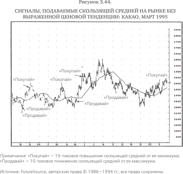 Проблема заключается в том, что если на рынках с выраженной тенденцией скользящие средние работают хорошо, то на колеблющихся рынках, где выраженного тренда нет, скользящие средние подают много ложных сигналов. Например, рис. 3.44 воспроизводит рис. 3.42, показывая сигналы к покупке в точках, где скользящая средняя поворачивает вверх по крайней мере на 10 тиков, и сигналы к продаже в точках, фиксирующих такие же повороты вниз. Тот же самый метод, который превосходно работал на рис. 3.43, – покупка при поворотах скользящей средней вверх и продажа при ее поворотах вниз – оказывается провальной стратегией на этом рынке, приводя к шести последовательным убыткам и одной бесприбыльной сделке.