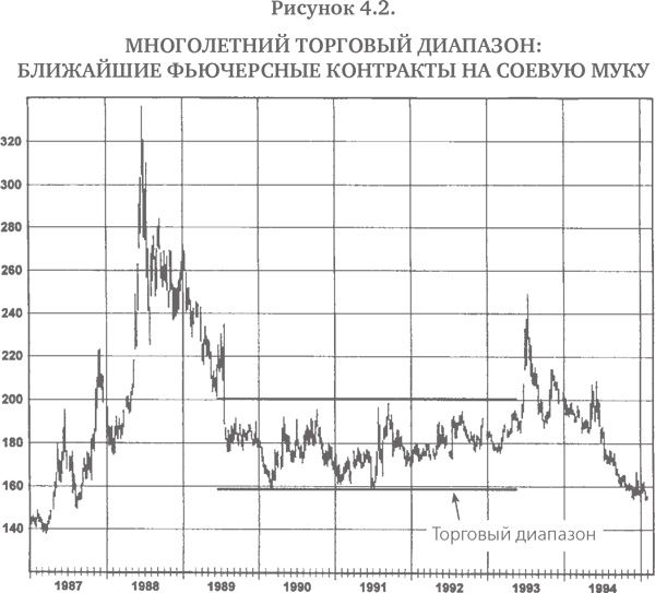 Торговые диапазоны часто могут длиться годами. Например, ко времени написания этой книги рынок серебра находился в торговом диапазоне уже четыре года (рис. 4.1). На рис. 4.2 изображен четырехлетний торговый диапазон на рынке соевой муки. Рис. 4.3 и 4.4 показывают многолетние торговые диапазоны на рынке пиломатериалов. Заметьте, что на двух последних иллюстрациях длительность торговых диапазонов различна для ближайших и непрерывных фьючерсов, хотя обычно они ведут себя почти синхронно.