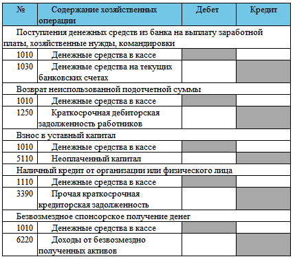 Перечень основных бухгалтерских записей по движению денежных средств в кассе приведены ниже в таблице.