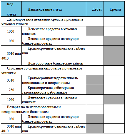 Основные бухгалтерские проводки по учету денежных средств в чековых книжках: