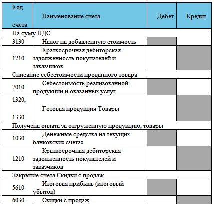 Основные рекомендуемые бухгалтерские проводки по признанию дебиторской задолженности и скидки с продаж и цены: