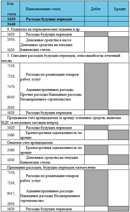 Учет расходов будущих периодов ведется на счете 1620 – «Расходы будущих периодов» подраздела 1600 – «Прочие краткосрочные актив».