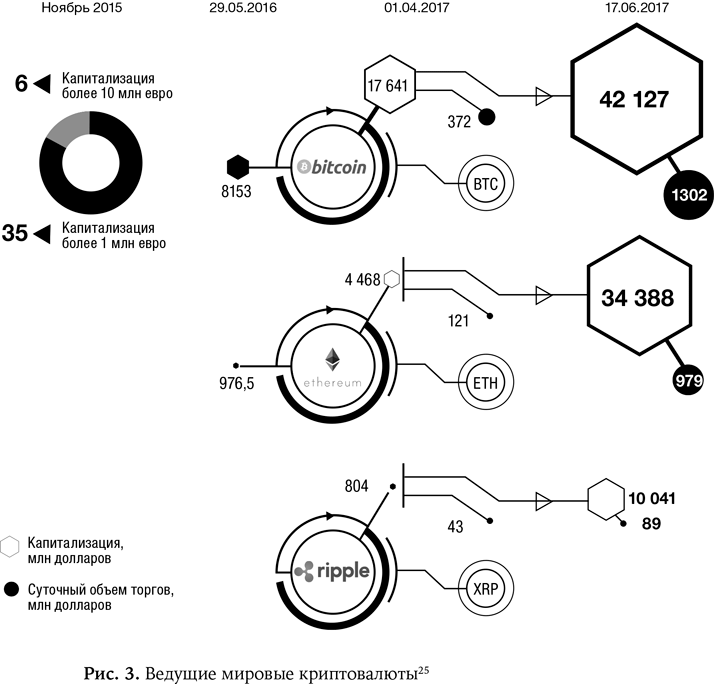 Рынок весьма динамичен. Так, еще в ноябре 2015 года, по расчетам Д. А. Кочергина{38}, только 35 децентрализованных схем виртуальных валют имели капитализацию более 1 млн евро, и всего шесть из них – капитализацию выше 10 млн евро. К числу виртуальных валют с наибольшей рыночной капитализацией в тот момент относились биткоин, Litecoin и Ripple.