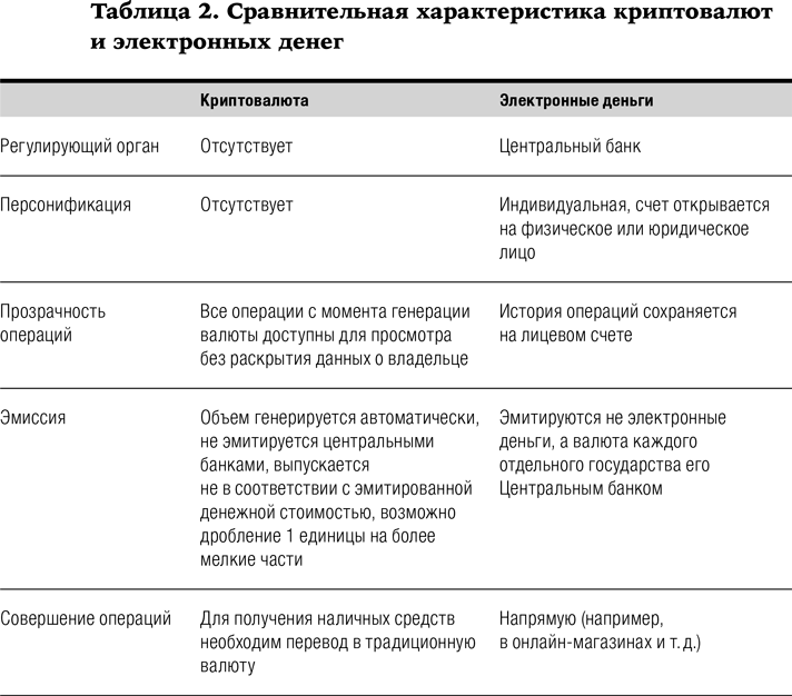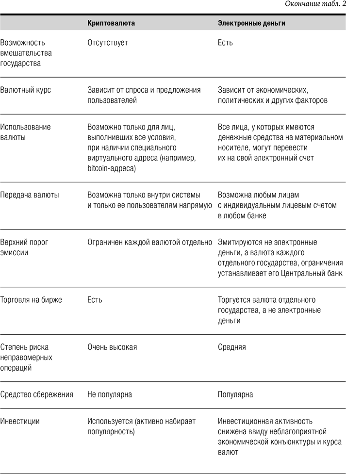 Фундаментальное сравнение криптовалют и электронных денег проведено в работе А. У. Альбекова и его коллег{64} (табл. 2).