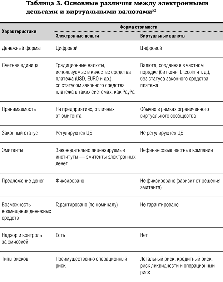 Д. А. Кочергин также выделяет{65} ряд характерных особенностей виртуальных валют в сравнении с электронными деньгами (табл. 3).