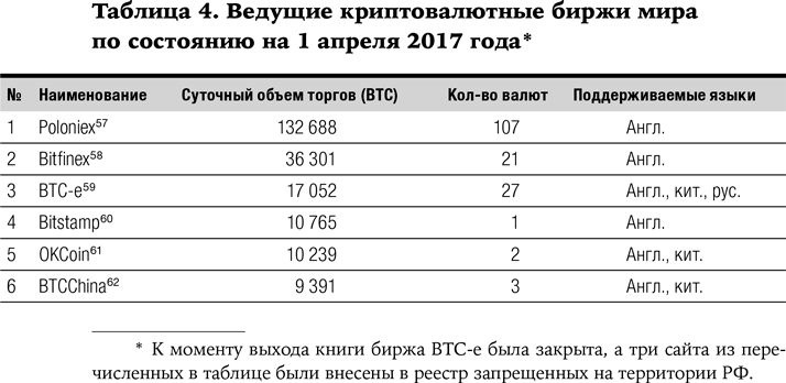 Список всех бирж криптовалют и обменников биткоин, Litecoin и их форков{70} на начало июня 2016 года содержал следующие данные об их местонахождении: