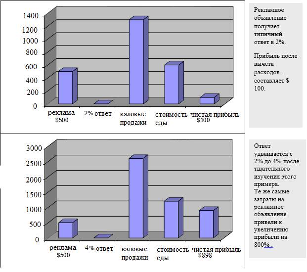 Все складывается из небольших улучшений. Следующие диаграммы ясно показывают, что удвоение или утроение откликов на вашу рекламу могут увеличить прибыль от 800 % до 2400 %!!!