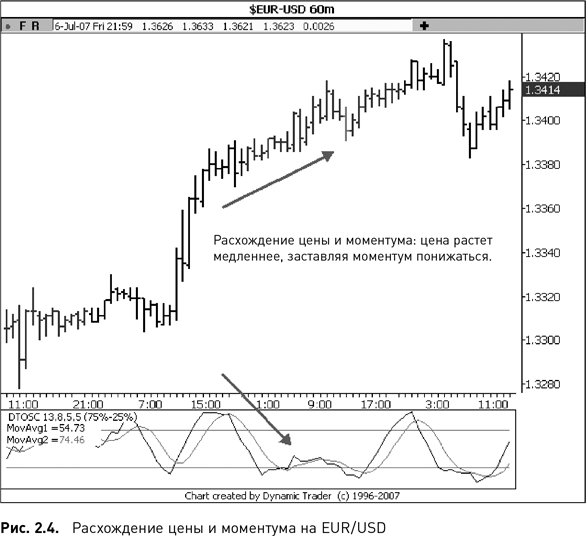 Рис. 2.4 представляет 60-минутный график Forex EUR/USD. Я прочертил стрелки, чтобы показать период, где разошлись цена и моментум. Цена продолжила движение вверх, а моментум повернул вниз. Почему? Хотя цена продолжала расти, скорость ее роста замедлилась, и это заставило моментум на некоторое время стать медвежьим.