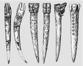 Берестяные грамоты, доскии церы выполнены в технике процарапывания. Запись велась писа?лом (инструмент для письма, длиной 12 см), в стиле «граффити» (печатными буквами, так как скоропись процарапыванием на бересте невозможна), на новгородском диалекте. Писа?ла (всего найдено около 300 в 20 пунктах; IX–XIV вв.: Киев, Старая Ладога, Великий Новгород (около 250), Минск, Гнездово) были железными, бронзовыми, костяными, деревянными (рис. 4). Один конец у них был заостренным (степень заострения писал была разной), другой имел художественное оформление, длительное время с колоритными языческими сюжетами (рис. 4.1), но после принятия христианства сюжеты стали сдержанными (рис. 4.2). Писала найдены также в погребениях, которые рядовыми не являются, они – с богатым инвентарем, оружием, весами для взвешивания монет, гирьками.[8] Ясно, что погребенные прижизненно вели учет.