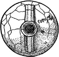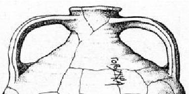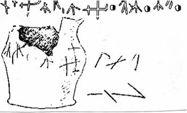 Рис. 7. Погребальная корчага (намеренно разбитая крымская амфора с остатками какого-то масла) из Гнездово (деревня с языческим кладбищем в 12 км к западу от Смоленска), найдена в 1949 г. (арх. Д. А. Авдусин) в курганном могильнике (их 2500, многие уничтожены). Наиболее ранняя русская надпись на кириллице (X в.); состоит из одного слова (гороухща) и имеет несколько версий перевода.