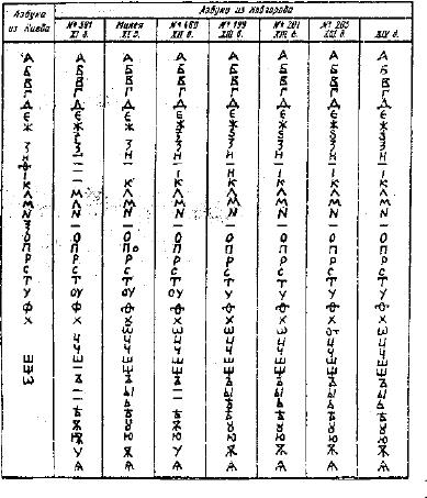 Наиболее ранняя азбука из Киева относится к началу XI в. и содержит 27 букв (23 греческие и 4 славянские: б, ж, ш, щ – звуки, отсутствующие в греческом языке). Она отражает этап письменности без-устроения, как об этом сообщает черноризец Храбр. Из 6 новгородских азбук наиболее ранняя относится также к началу XI в., но состоит из 29 букв, в т. ч. 11 славянских [НБГ 591; XI в.]. Азбуки XII в. содержат 34 буквы, из них 12 славянских [НБГ 460; XII в.]. Еще 4 азбуки имеют 36 букв, в которых 14 – славянские [НБГ 199, 201, 205; XIII в.]. Азбука XI в. из Синодальной библиотеки под названием Минеи содержит 34 буквы, из которых 14 – славянские.