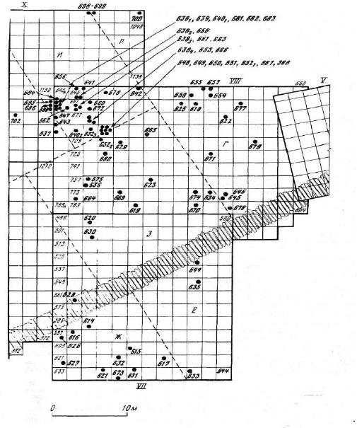 Рис. 8. Великий Новгород. Схема Троицкого раскопа (1984–1989 гг. с указанием мест обнаружения берестяных грамот, – локализованы за пределами мостовой). [В. Л. Янин, А. А. Зализняк. НГБ, 1993, с. 5].