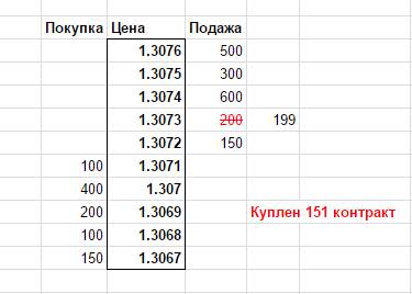 В результате этой покупки на уровне 1.3073 останется 199 контрактов и цена продвинется ровно на 1 пункт вверх. Если ни у одного покупателя или продавца не возникнет желания купить или продать, то цена будет стоять на месте.
