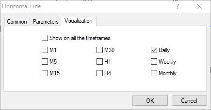 Видимость горизонтальных линий делаем “только дневной график” (рис. 15). Для этого правой кнопкой мыши выбираем свойства линии и в закладке “Visualization” выбираем “Daily”.