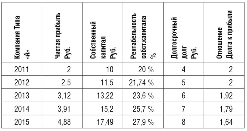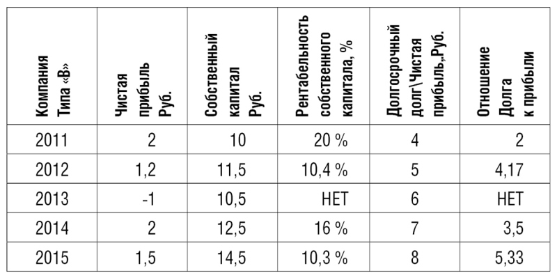 Вот так примерно должна выглядеть финансово-успешная компания, которая генерирует прибыль и увеличивает объемы собственного капитала для своих акционеров и держит долгосрочный долг под контролем. Как правило это компании, обладающие уверенным конкурентным преимуществом, имеющие узнаваемый бренд и расширяющие свой бизнес в большей степени за счет собственных средств. Поэтому такие компании называют растущие. Цифры, приведенные в таблице, носят гипотетический характер, но они показывают некий шаблон того что мы называем успешным, растущим бизнесом.