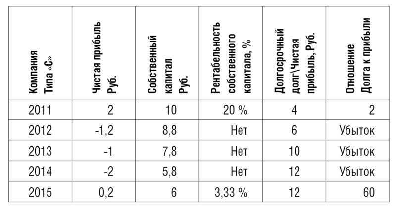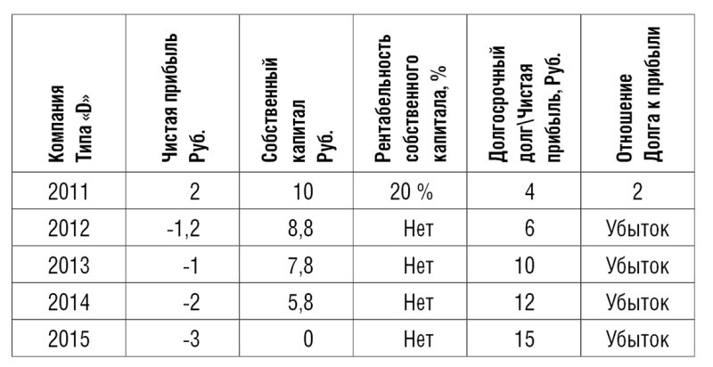 Компания типа «D» кандидат в банкроты. Из 5 лет работы 4 года в убыток, собственный капитал потерян, долгосрочный долг резко вырос.