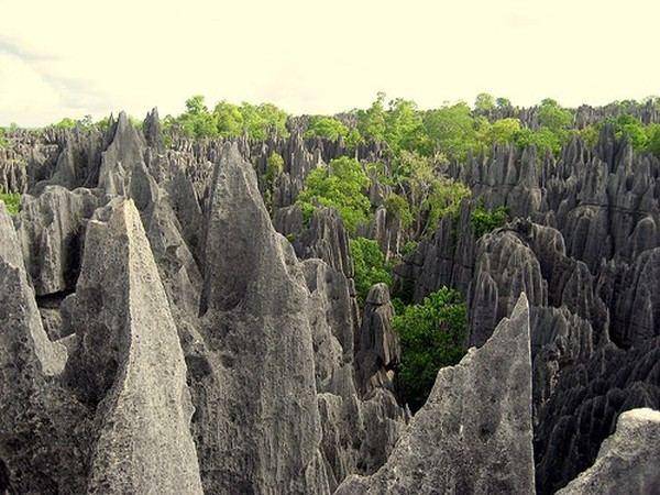 Среди сухих лиственных лесов Мадагаскара на территории в 370 км2 расположены необычные карстовые образования известняка, известных как каменный лес Тсинги (рис. 6). Это малагасийское название района («Tsingy»), которое переводится как место, «где никто не может ходить босиком». Известняки здесь эродированы муссонными дождями, ветром за тысячи лет и превратились в острые скалистые пики, поднимающиеся на сотни метров, каньоны и пещеры с подземными реками. Несмотря на суровые условия, здесь обитает 11 видов лемуров и эндемические растения [68].