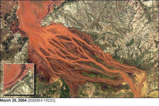 Интенсивную эрозию почв вызывают вырубки лесов в центральных горных районах Мадагаскара под воздействием климатических условий при особенностях геологического строения и почвенных условий. Для Мадагаскара, страны, для которой сельскохозяйственное производство является основой экономики, потеря почв особенно опасна и носит катастрофический характер. В некоторых районах смыв почвы в результате эрозии составляет в среднем 250 т с гектара в год и может превышать 400 т. Преобладание на острове красноцветных почв обусловливает окрашивание вод рек, что наблюдается даже из космоса. За исторически короткий период дельты рек быстро растут, заполняя прибрежные акватории (рис. 10). Драматическое свидетельство последствий эрозии в северо-западной части Мадагаскара видно на фотографиях дельты реки Бетсибока, сделанных в 1983 и в 2004 гг. Лиман, в который впадала река за 20 лет оказался заполнены осадками из смытых почв, а когда-то океанские корабли не только заходили в воды лимана, но и поднимались вверх по устью р. Бетсибока. Теперь же они остаются на рейде у побережья.