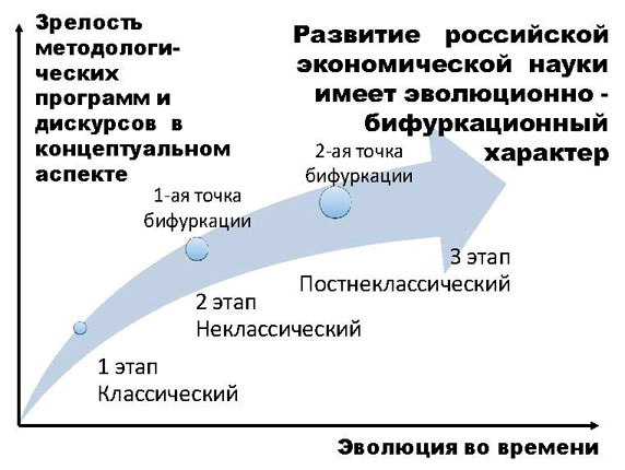 Развитие дискурса российской экономической науки прошло две основные бифуркационные точки; путем эволюции российская экономико-теоретическая наука на каждом этапе выходила на новый качественный уровень научного познания.
