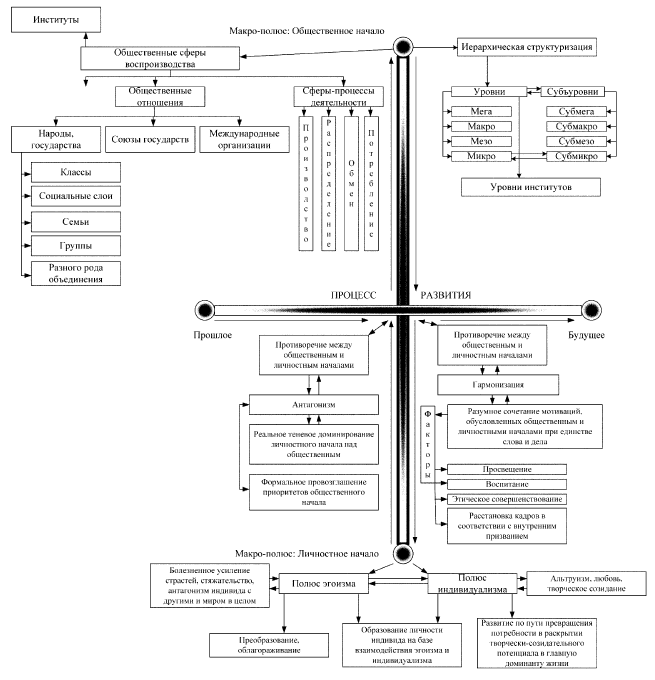 Положение 6. Микрополюс, представленный личностным началом, постоянно осуществляя челночное взаимодействие с макрополюсом, являющим собою общественное начало, ежемгновенно взаимопересекается с процессом развития общества и его институтов. При этом имеет место объективное противоречие между общественным и личностным началами. В зависимости от комбинации факторов развития общества и стечения исторически конкретных обстоятельств, данное противоречие характеризуется либо антагонизмом, либо гармонизацией.