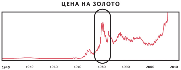 В 1979–1980 годах состояние американской экономики было даже более плачевным, чем во время финансового кризиса 2007–2008 годов, рынки тоже отличались более высокой волатильностью. Ниже приведены графики, отражающие колебания процентных ставок и цены на золото вплоть до 1940 года. Как видите, ничего похожего в период до 1979–1982 годов не происходило.