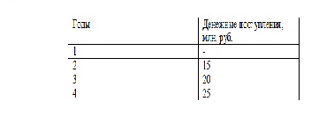 NPV= 0/(1+0,1) 1 + 15/(1+0,1) 2 + 20/(1+0,1) 3 + 25/ (1+0,1) 4 -40 = 4,5млн. руб.