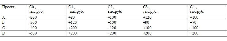 Пусть фирма оценивает 4 проекта со следующими данными: