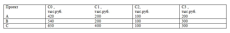 Имеются три проекта А, В, С, начальная стоимость которых и планируемые потоки доходов по годам приведены в таблице 13.