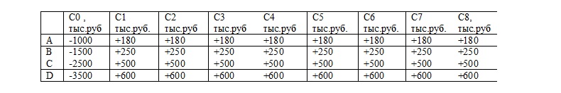 Фирма решила приобрести машину для выпечки печенья и рассчитывает использовать ее в течение 8 лет. Предполагается, что ежегодно машина будет обеспечивать одинаковый объем производства. Необходимо выбрать между четырьмя машинами, потоки денег от которых ожидаются следующими: