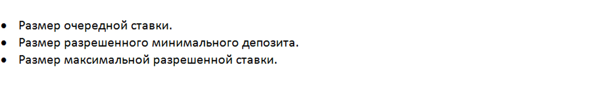 А если капитала не хватает сделать очередную ставку или размер очередной ставки превышает разрешенный размер, то у игрока остаток капитала превышает минимально разрешенный депозит. Значит, игрок может не пополнять свой капитал и продолжать игру. Только эта игра уже не будет продолжением текущей игры.