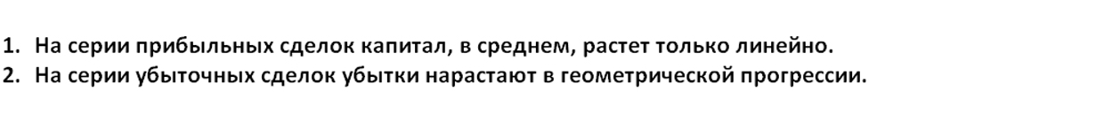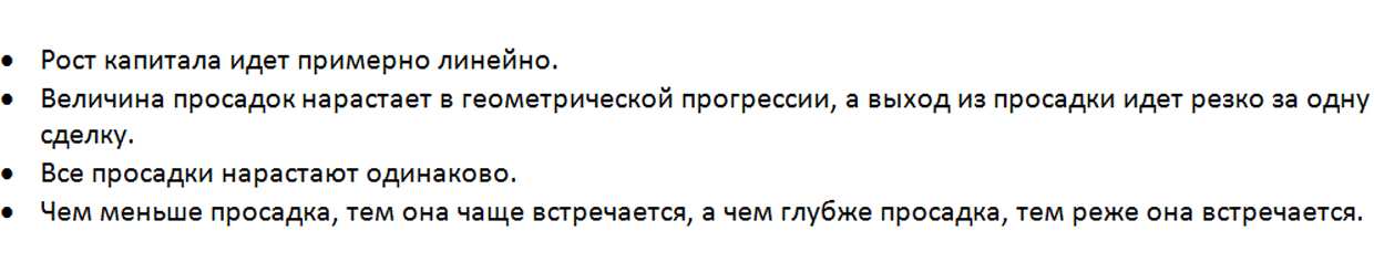Характерной особенностью графиков изменения капитала игрока является почти прямая линия, по которой увеличивается капитал и постоянно появляющиеся просадки этого капитала вниз. Причем, чем просадка меньше, тем чаще она появляется. А чем просадка глубже, тем она реже появляется.