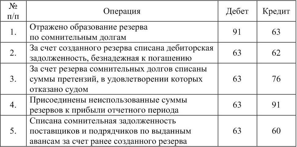 На сумму создаваемых резервов сомнительных долгов дебетуют счет 91 «Прочие доходы и расходы» и кредитуют счет 63 «Резервы по сомнительным долгам». Списание невостребованных долгов, признанных сомнительными, отражают по дебету счета 63 с кредита счетов 62 «Расчеты с покупателями и заказчиками» и 76 «Расчеты с разными дебиторами и кредиторами». Списанные долги должны учитываться в течение пяти лет на забалансовом счете 007 «Списанная в убыток задолженность неплатежеспособных дебиторов».