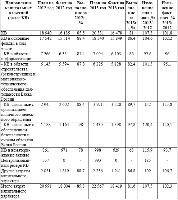 Таблица 3.2 – Исполнение сметы капитальных вложений Банка России за 2012–2013 гг., млн. рублей[12]