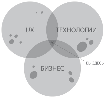 По словам Марти Кагана, партнера-основателя Silicon Valley Product Group, 30 лет занимавшегося управлением продукта, «работа менеджера заключается в поиске ценного, удобного в использовании и целесообразного продукта». Для соавтора книги Мартина Эрикссона управление продуктом — это точка пересечения бизнеса, опыта пользователя и технологий (см. иллюстрацию 1–1; только продакт-менеджеру пришло бы в голову определить себя диаграммой Венна!). Хороший менеджер продукта обладает опытом по меньшей мере в одной сфере, проявляет энтузиазм[1] ко всем трем и способен изъясняться с профессионалами на эти темы.