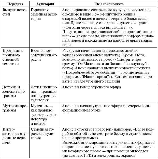 Для понимания того, каким образом организовать анонсирование, необходимо понять аудиторию, на которую направлен анонс, т. е. программы для женской аудитории не должны анонсироваться в рекламных блоках в передачах для мужской аудитории и наоборот. В табл. 5.3 представлена программа анонсов.